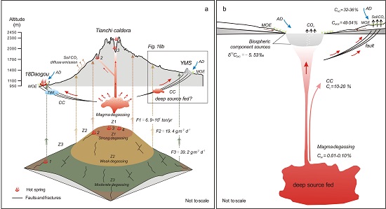 图4 长白山天池火山(a)及圆池玛珥湖火山区(b)CO2释放示意图