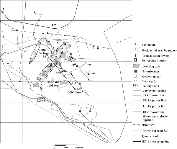 他们以试验剖面BD-1测线跨铜陵市冬瓜山铜矿床主矿体,经实地调查(图1),试验区被几条高压线(220kV高压线一条,110kV高压线4条,35kV高压线一条)包围于约1~2km范围的圈内,并有52个10kV变压器。在测线西南方约200m的地下深度约800~1000m处的采矿干扰源主要为地下坑道内的大功率的卷扬机、轨道火车、电瓶车,开采面上的机械设备以及通风口处的鼓风机等干扰源,这些机械设备一般情况下均24小时运转,也是影响CSAMT观测的主要电磁干扰源。试验区具有较大的人文干扰情况。