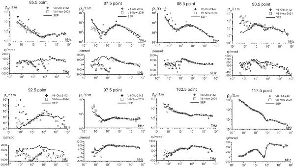 经实测曲线比对(图2),测线的85.5-88.5点是采石场,观测数据时地面上有碎石机和铲车施工,此时测得的85.5、87.5和88.5点受强电磁干扰,V8观测的视电阻率和相位曲线在低于30Hz的跳点较多,SEP和V8(E2)获得较为圆滑曲线;89.5至95.5点处于矿区职工住宅小区,受地面和来自地下采矿主巷道的强电磁干扰影响,V8采集的90.5点和92.5点曲线形态较差,V8(E2)采集曲线较V8有所改善,SEP采集数据曲线形态更为圆滑合理;从96.5点至120.5点为干扰小地段,SEP和V8仪器均采集到高品质数据。