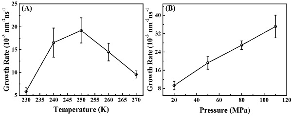 模拟结果显示,甲烷是氢气-甲烷二元气体水合物生长的热力学促进剂,而氢气为此二元气体水合物生长的动力学促进剂;在50MPa下,氢气-甲烷二元气体水合物的生长在250K时最快(图2A);保持温度恒定为250K时,水合物生长速率和压力成正相关(图2B);气体组成、压力和温度都会影响生成水合物结构中客体分子的占有率,从而影响水合物的能量密度;溶液相中氢气和甲烷的浓度和扩散系数控制了氢气-甲烷二元气体水合物的生长过程,并且甲烷的作用更大。该研究极大地促进了人们对二元气体水合物形成过程的理解。
