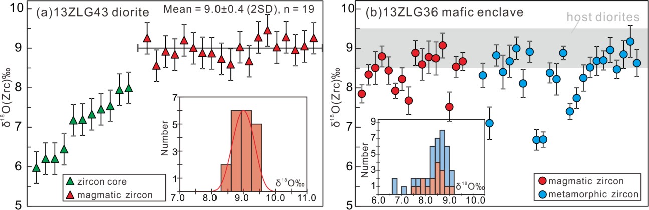 研究结果显示:朱拉沟岩体中的单斜辉石和角闪石与包体的单斜辉石和角闪石具有相似的主微量元素特征(图1),暗示镁铁质包体是闪长岩体的暗色矿物堆晶体,因此,闪长岩体的富集镁铁质成分取决于暗色矿物(角闪石和单斜辉石)的比例不同。此外,闪长岩体具有高的锆石δ18O值(~9.0‰,图2),是目前发现的太古宙岩体中最高的δ18O值。朱拉沟岩体所记录的高δ18O值特征,并不是由围岩混染或变质作用导致的,而是代表了源区的性质。源区玄武质岩石经历了低温热液蚀变,使得氧同位素值升高,而后玄武岩被埋藏至下地壳,并发生了部分熔融,形成了高δ18O闪长岩体(图3)。矿物化学、地球化学及Sm-Nd和锆石Lu-Hf同位素结果支持闪长岩体是来自下地壳含水玄武质岩石的部分熔融,该过程可能发生在大陆边缘弧的环境(图3)。