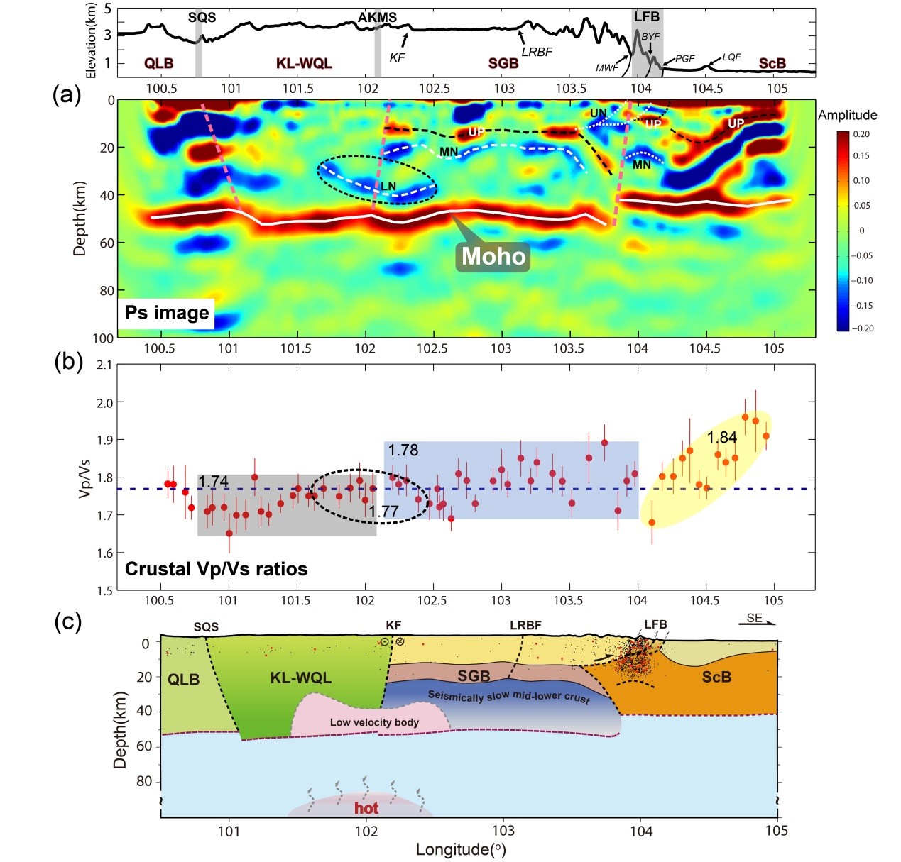 中科院800彩票岩石圈演化国家重点实验室大陆岩石圈演化动力学学科组博士研究生王旭与导师陈凌研究员等人基于密集流动地震台阵(图1)的远震波形记录,应用P波接收函数(P-RF)方法对青藏高原东缘-东北缘地壳结构与性质展开了研究。结果显示:块体构造边界处莫霍面存在明显跳变,指示了块体间的深部接触关系和边界形态;四川盆地至龙门山地区地壳相对较薄,波速比从高到低变化强烈,四川盆地地壳组分总体偏镁铁质;青藏高原地壳较厚,昆仑-西秦岭波速比低、地壳组分偏长英质,而松潘-甘孜地壳则表现为相对较高的波速比。另外,P-RF偏移图像(图2a)进一步揭示了研究区的壳内结构特征:四川盆地自中部(~6km)至西缘(~15km)结晶基底逐渐加深,松潘-甘孜块体的结晶基底整体偏深(~15km)、中下地壳波速较低;昆仑断裂东端附近地壳底部存在明显低速异常。