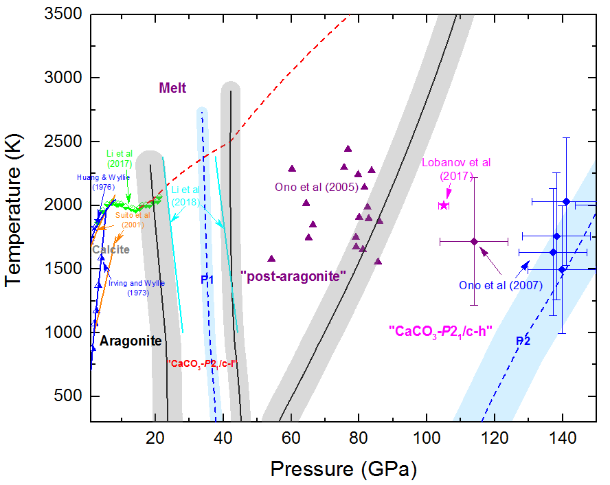 近年来,人们发现碳酸盐的高压相非常复杂。计算矿物学预测,碳酸钙与碳酸镁成分的高压(介稳)相有十余种之多,其中碳酸钙的晶型变化尤为丰富,在其文石相(aragonite)与后文石相(post-aragonite)之间有可能稳定存在单斜结构的新相,而在后文石相之后应当也有单斜结构的高压相稳定存在,最近的高温高压实验接连证实了这些新的高压相。依据这些新结果,人们推测碳酸钙在下地幔底部也许能够“抵御”分解、熔融与反应,从而长期稳定存在。而新的高温高压实验表明,碳酸钙甚至能在碳-铁氧化还原反应中“存活”下来,似乎也进一步表明碳酸钙在高压条件下将具有“强大生命力”。