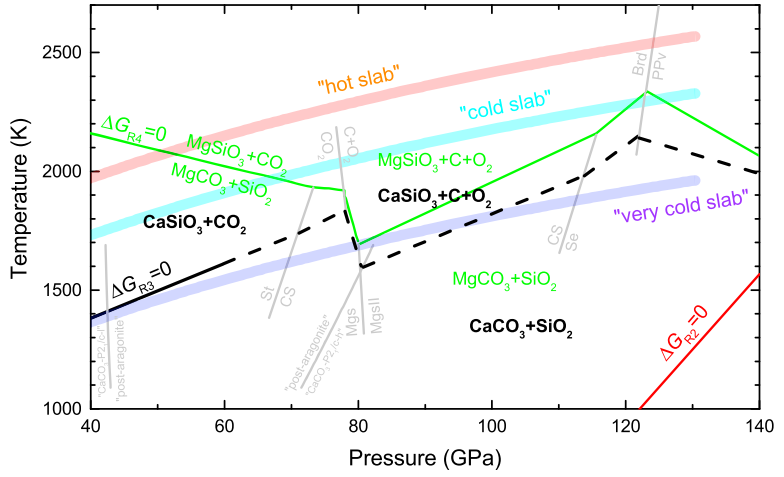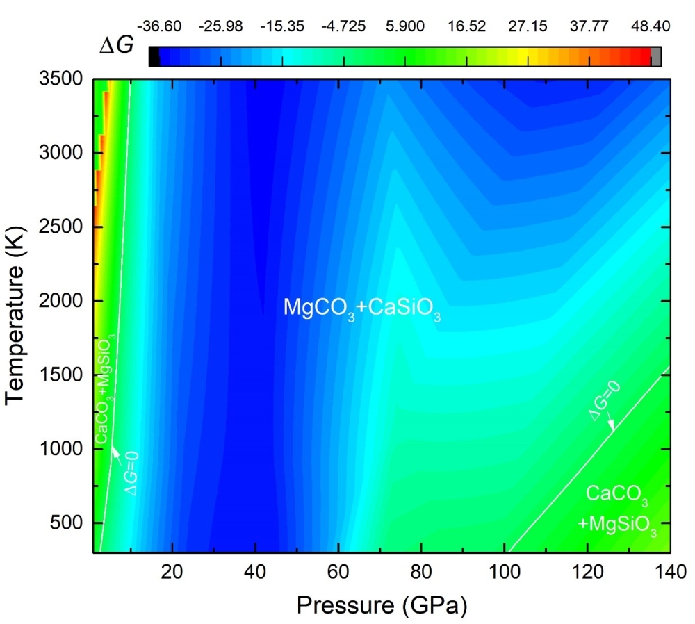 基于上述结果,他们进一步计算了CaCO3与MgSiO3的反应平衡(图2)。结果表明,由于CaCO3晶型变化带来的压缩效应,常温下碳酸钙到100GPa左右确实会比碳酸镁稳定(这与前人研究预测一致),但是高温下的熵效应又会破坏CaCO3的稳定性。在大约1500K以上,整个地幔条件下CaCO3都会倾向于与MgSiO3反应而生成MgCO3。