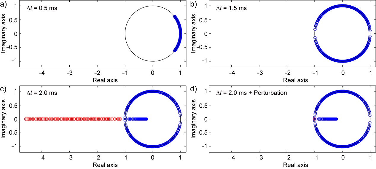 1 特征值扰动示意图。采用不同时间步长所获得的特征值:(a) Δt = 0.5 ms(b) Δt = 1.5 ms(c) Δt = 2 ms(d) Δt = 2 ms(d)(c)经过特征值扰动后的结果。本实验中,CFL所允许的最大时间步长为1.53 ms