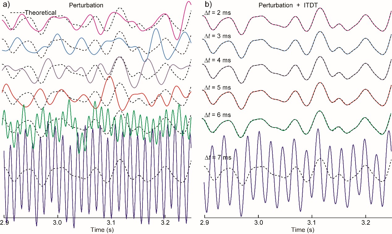 2 利用不同时间步长获得的单道波形记录。依次测试了时间步长Δt = 2, 3, 4, 5, 6, 7 ms(a)是采用过特征值扰动算法之后得到的模拟波形;(b)是对(a)采用了逆时离散时间变换后的结果。本实验中,CFL所允许的最大时间步长为1.53 ms,震源子波函数对应的奈奎斯特采样上限为6.7 ms