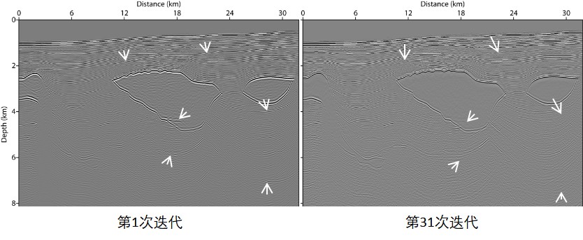 如图所示,经过31次迭代后,大部分串扰噪声被消除;31次迭代的计算量与常规最小二乘逆时偏移的一次迭代计算量相当。作者进一步利用平面波最小二乘逆时偏移实现了一次反射波与表面多次波的联合成像。该方法可拓展到三维地震表面观测数据中,有效地提高地下成像的覆盖次数和照明范围。