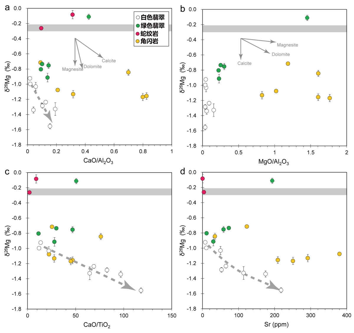 图2 翡翠及围岩的δ26Mg与CaO/Al2O3、MgO/Al2O3、CaO/TiO2和Sr相关性图解
