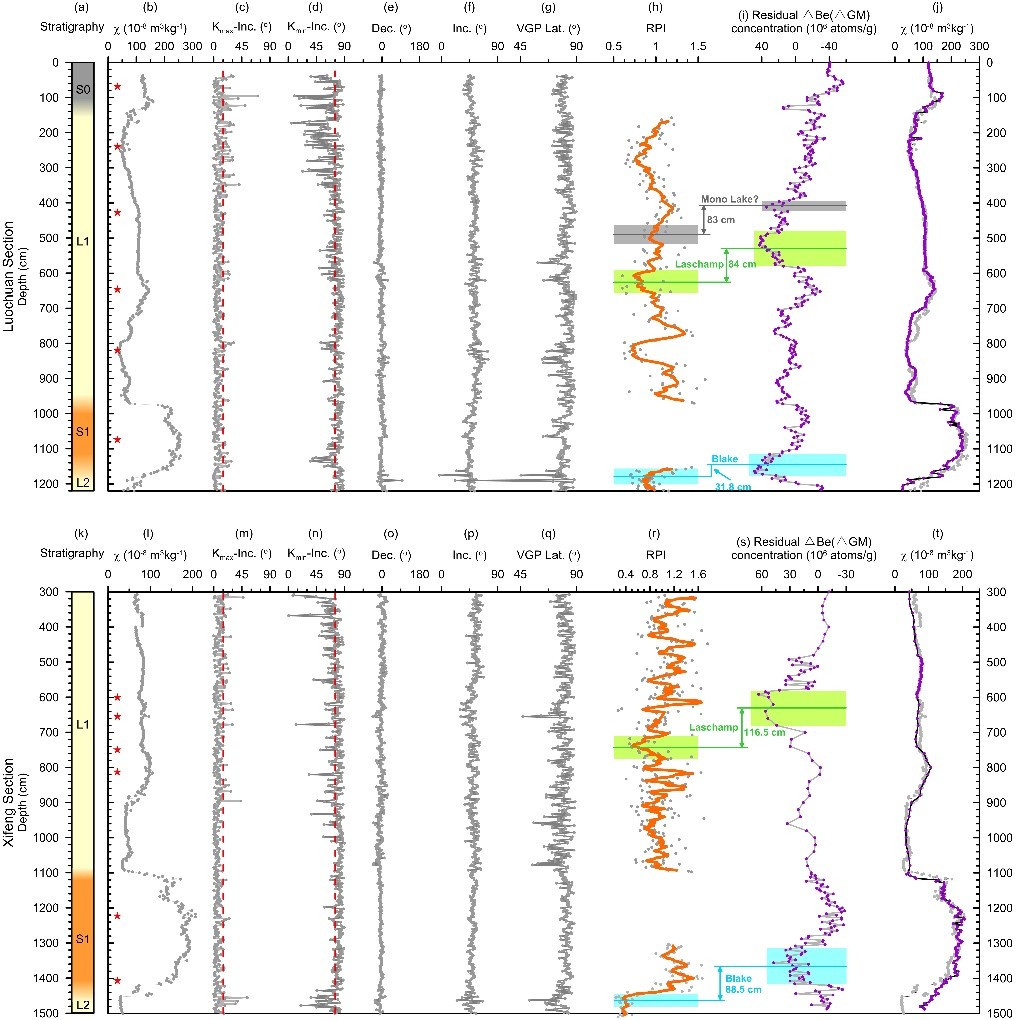 图1 洛川(上)、西峰(下)S1以来单套样品的磁记录。b+l.磁化率;cd+mn.磁组构;efg+opq.古地磁方向;h+r.地磁场相对古强度曲线;j+s.10Be指代的地磁场相对古强度;j+t.前人磁化率(紫)与本文磁化率(灰)的地层对比