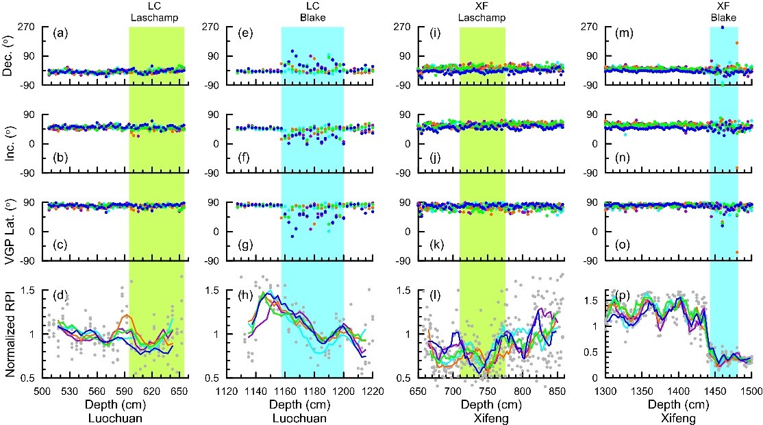 图2 洛川、西峰剖面关键层段5套平行样品的古地磁方向和RPI结果