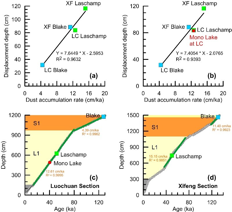 图3 末次间冰期以来的黄土剩磁错位深度与估算的堆积速率之间的关系。a/b分别为无/有Mono Lake事件的情况;c/d分别为洛川和西峰剖面的沉积速率估算