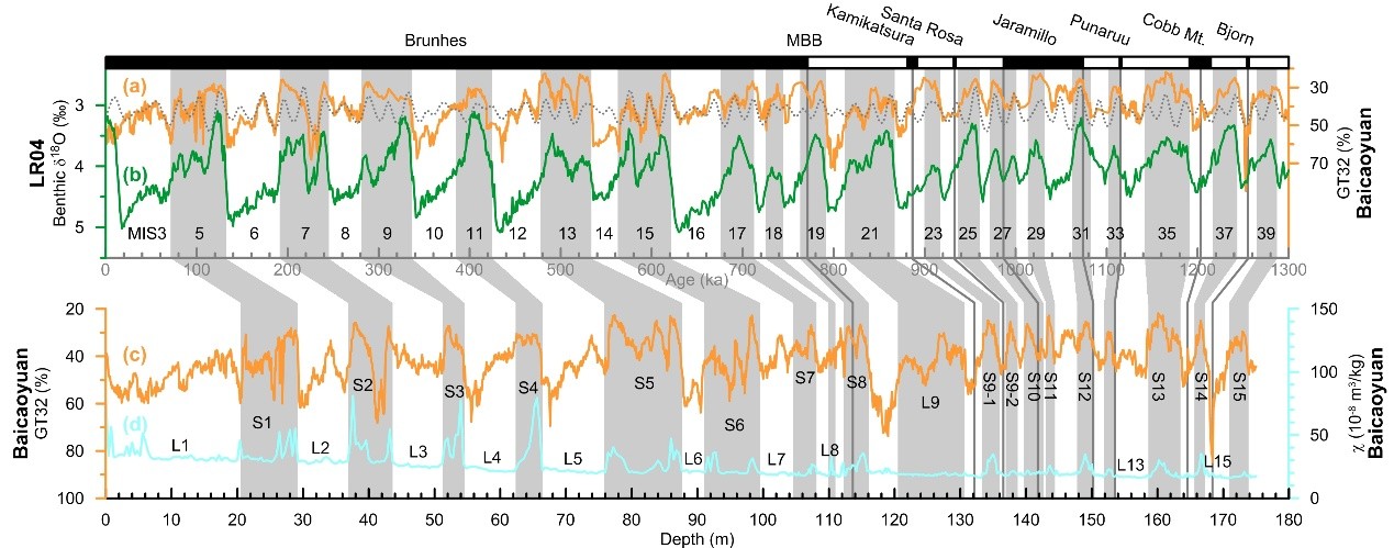 本研究量化了中国黄土天然剩磁锁定深度,提出它与黄土堆积速率之间的线性关系。基于此,给出了新的黄土时间标尺,从而调整了黄土与深海δ18O的对应关系,或有助于解释黄土古气候遗留难题。