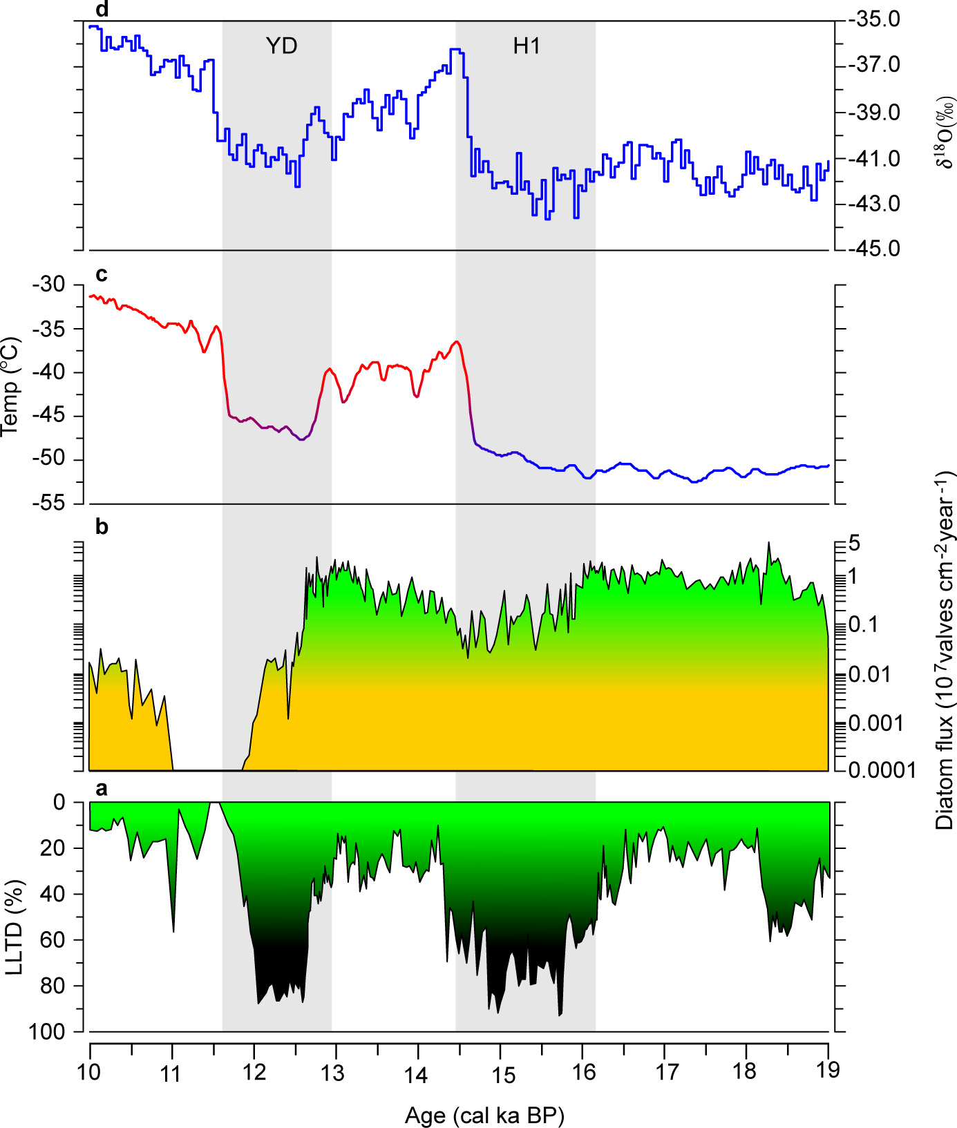 图1 硅藻指示的新仙女木时期强降雪。a. 耐低光硅藻百分含量;b. 硅藻通量; c. 格陵兰末次冰消期温度变化;b. 格陵兰末次冰消期氧同位素变化