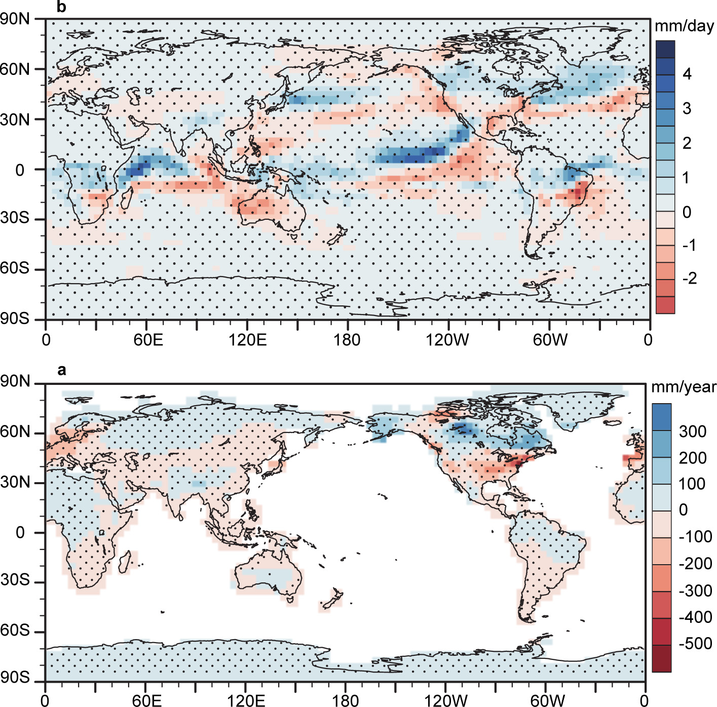 图3 全球降雪瞬变模拟数据分析结果。a. 全球累积降雪异常图;b. 全球累积冬季降水异常图
