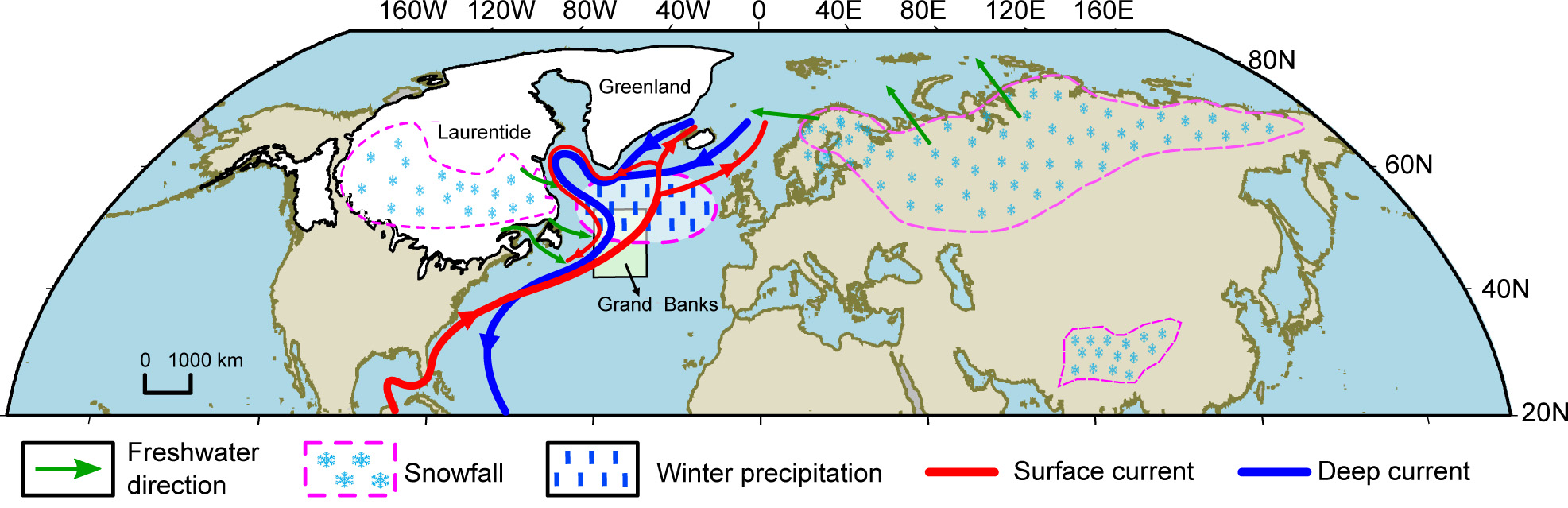 图4 大雪融水注入北大西洋和北冰洋示意图。北美、欧亚北部大雪融水提供持续的淡水,通过河流直接流入北大西洋和北冰洋,维持海表面较低的盐度