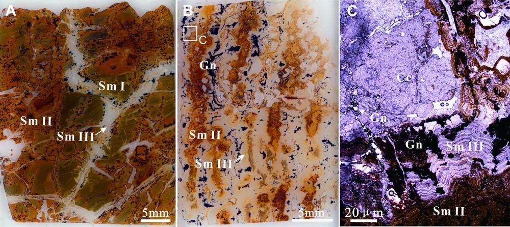 图3 火烧云铅锌矿成矿阶段。A. 菱锌矿(SmI)为菱锌矿(SmII)交代,及裂隙充填菱锌矿(SmIII)穿插菱锌矿(SmI 与SmII)中;B. 块状菱锌矿具有交代结构,并发育有白铅矿、方铅矿; C. 菱锌矿(SmII 与SmIII)、白铅矿及方铅矿的相互关系(单偏光下显微照片)