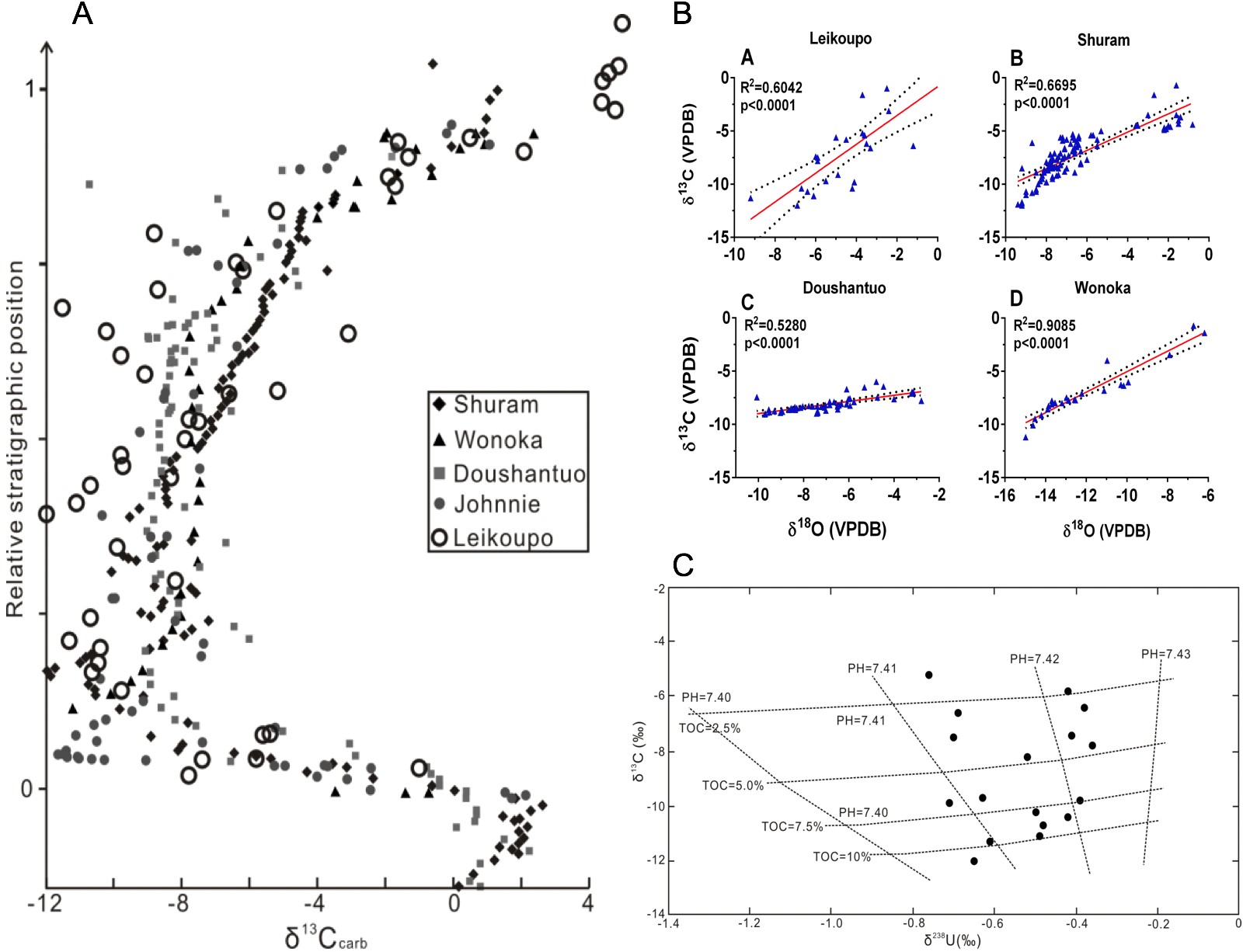 图2 雷口坡组底部富蒸发岩碳酸盐岩地层的碳同位素漂移的幅度与空间演化特征。(A)碳氧同位素的相关性特征(B)与Shuram事件非常相似;(C)成岩模拟证明了所测试的δ238U和δ13C值可以在pH=7.40-7.43,TOC=2.5-10%条件下碳酸盐自生过程产生