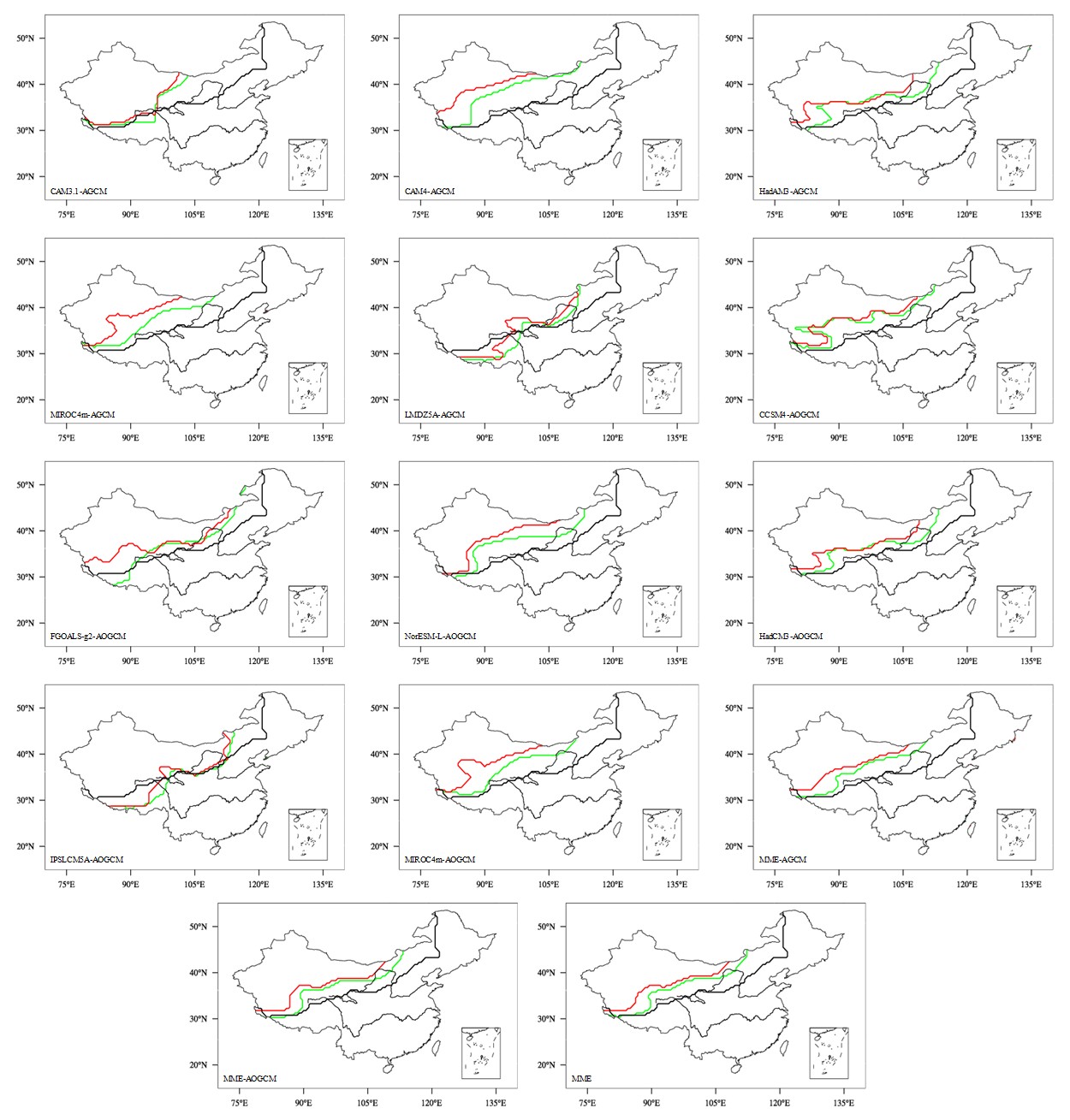 图1 工业革命前(绿线)、中上新世(红线)以及现代(1981-2010,黑线)东亚夏季风北边缘的变化情况