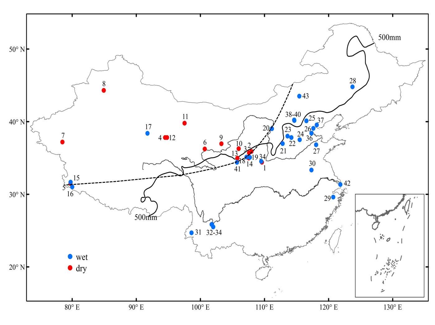 图2 中上新世古气候记录。实线指降水量为500毫米的等值线,代表现代湿润-半湿润和干旱-半干旱地区的分界线;虚线表示中上新世干湿分界线
