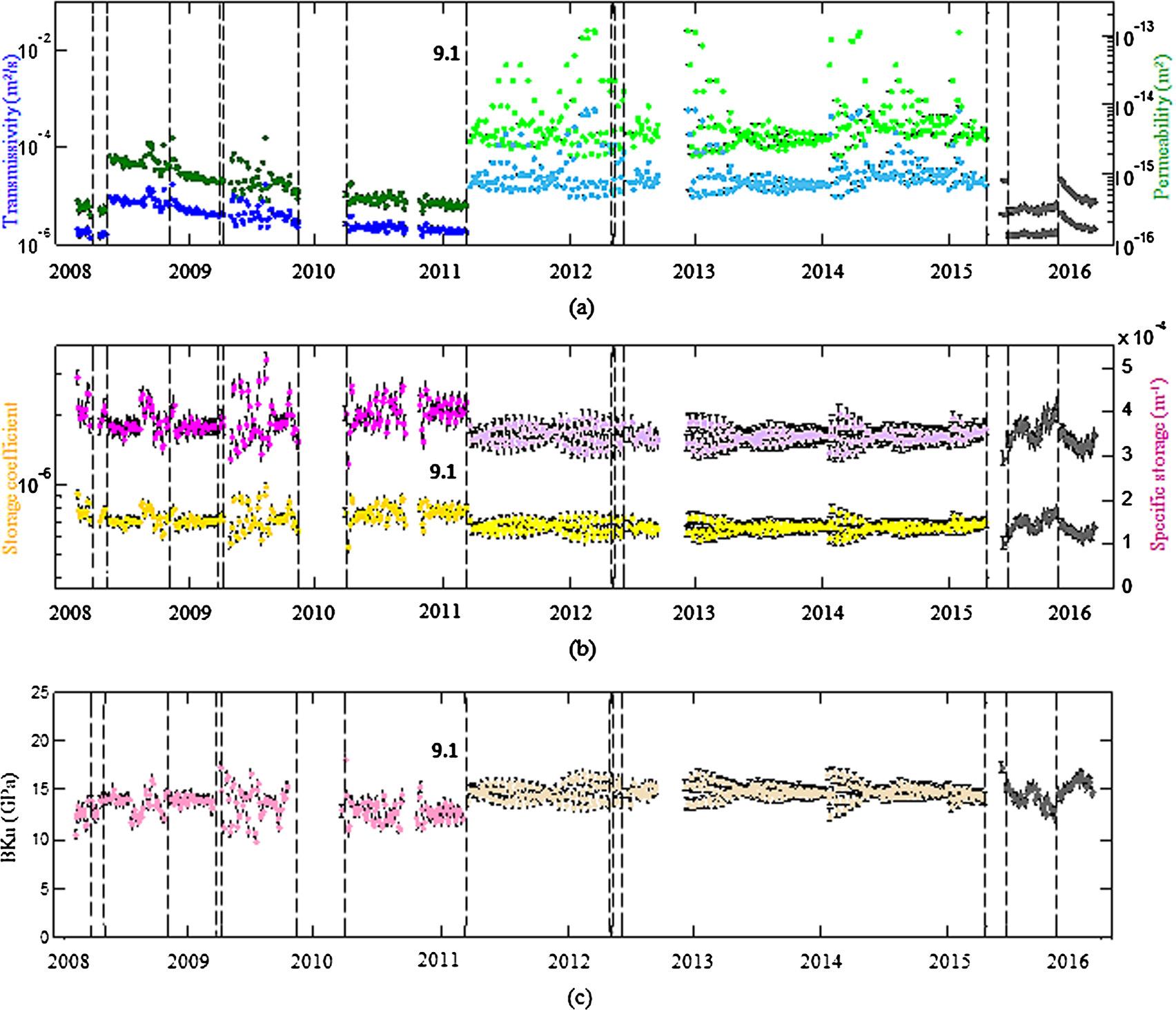 图2 按照Hsieh的水平流模型计算所得2008年2月1日至2016年3月31日的左家庄井的(a)导水系数(蓝色)和渗透率(绿色),(b)储水系数(黄色)和储水率(紫色),(c) BKu. 虚线表示地震发震时刻
