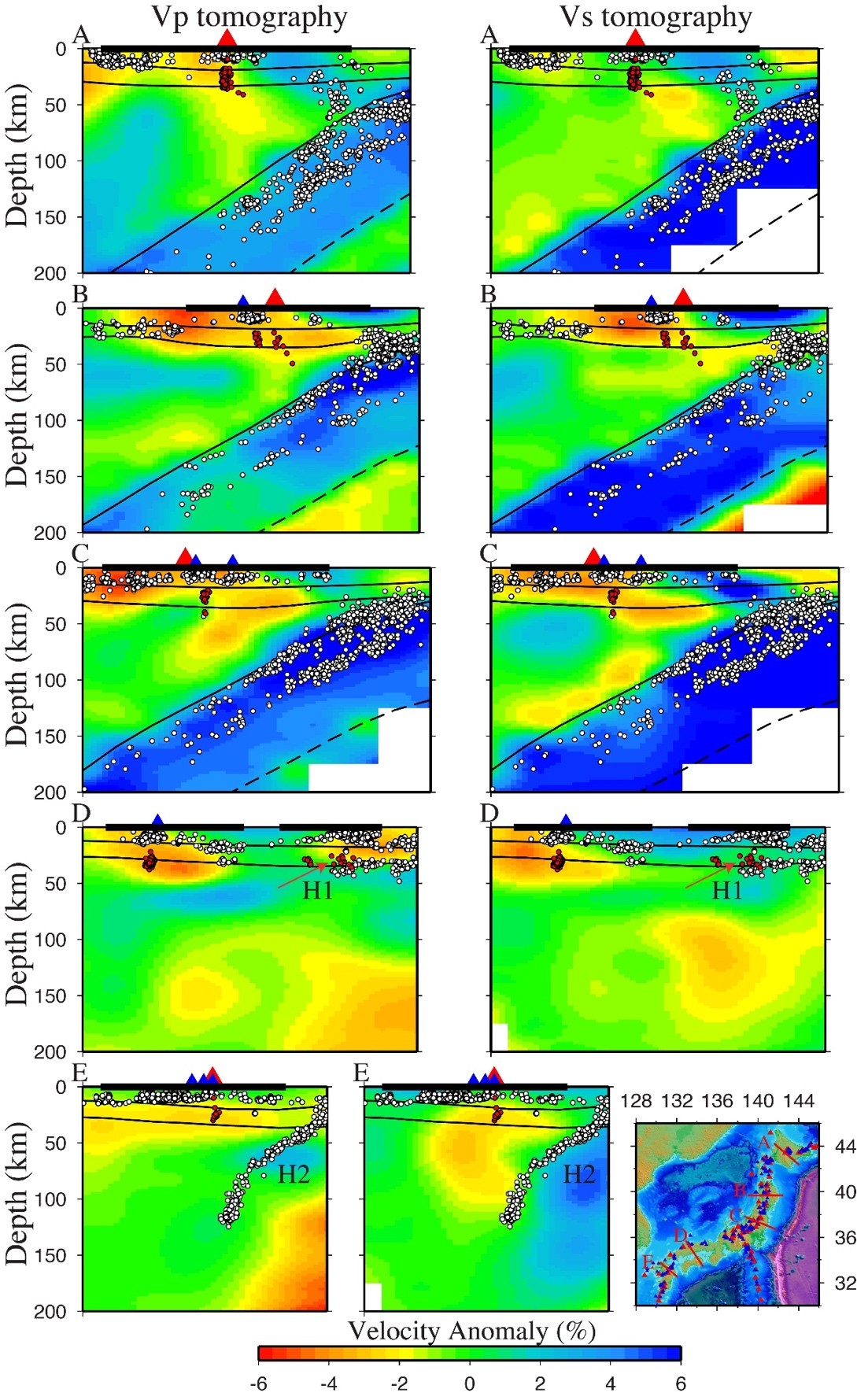 图4 将PickNet拾取的震相数据直接用于层析成像反演得到的日本俯冲带地区P波(左),S波(右)速度异常。成像结果揭示了菲律宾海板块俯冲形态的变化、火山下方的低速体及其与低频地震分布之间的联系等,这些结果与前人层析成像结果有很好的一致性