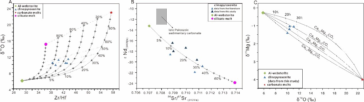 研究成果发表于Geochimica et Cosmochimica Acta. (Hu J, Jiang N*, Carlson R W, Guo J H, Fan W B, Huang F, Zhang S Q, Zong K Q, Li T J, Yu H M. Metasomatism of the crust-mantle boundary by melts derived from subducted sedimentary carbonates and silicates[J]. Geochimica et Cosmochimica Acta, 2019, 260: 311-328. DOI: 10.1016/j.gca.2019.06.033)(原文链接)