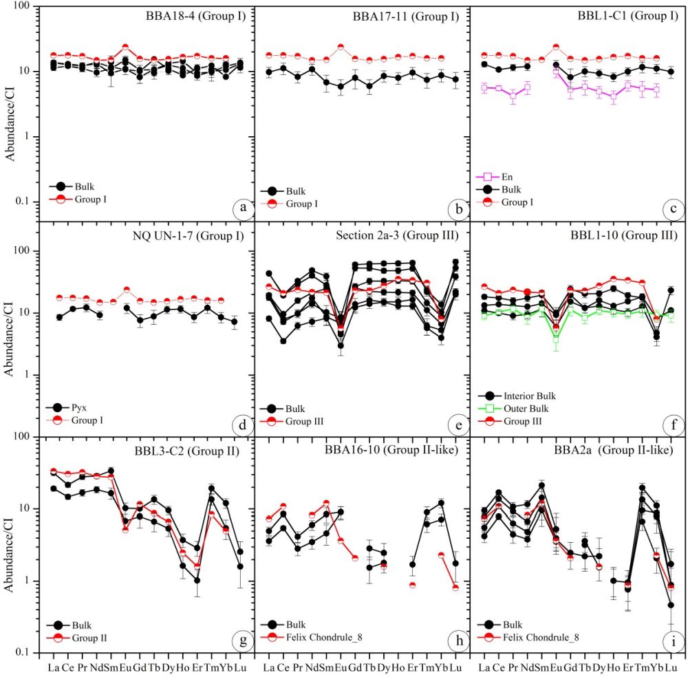 通常认为难熔包体形成于靠近原始太阳的高温区域,而后被抛射或搬运到整个原始星云盘,最终与其他物质一起聚积形成星子,包括各类球粒陨石的不同母体小行星。另外,在原始星云盘中还普遍存在另一种高温加热事件,形成了球粒陨石中最主要的组分,即各种硅酸盐球粒。但是,有关难熔包体与球粒这二类组分之间的成因关系不清楚,而一些特殊的富铝球粒可以为厘清这二类重要组分之间的关系提供重要的制约。为此,张明明等对Allende和宁强碳质球粒陨石中13个富铝球粒开展了岩石学、矿物化学、全岩主微量元素以及原位氧同位素分析,发现了指示难熔包体来源的残留镁橄榄石、尖晶石和富铝钛透辉石,表明这些富铝球粒的形成是由混入难熔包体的初始物质高温熔融形成。更为重要的发现是,混入的难熔包体在化学组成上,包含了已知5种REE配分模式中的3种(I型、II型和类II型、III型)(图2)。此外,富铝球粒和普通球粒具有相同的氧同位素组成(Δ17O~-5‰,图3),指示两者在相同区域熔融。该发现表明各类型难熔包体形成之后,一起被搬运到球粒陨石形成区域,并与镁铁硅酸盐物质混合,然后加热熔融形成富铝球粒。新的发现不支持富铝球粒是难熔包体与球粒形成过程的中间产物的观点。