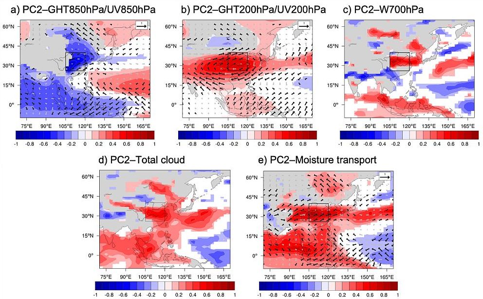 图1 暖季(五月至九月)降水一致变化模态匹配的大气环流的相关图。(a)850hPa水平风异常场(矢量)和850hPa位势高度异常场(阴影);(b)200hPa水平风异常场(矢量)和200hPa位势高度异常场(阴影),(c)700hPa垂直风异常场(-Ω,阴影);(d)总云量异常场(阴影),和(e)对流层整层积分水汽输送异常场(矢量)和可降水量异常场(阴影)。矢量图为通过90%置信检验的相关系数,黑色箭头对应于通过90%置信检验的相关系数,灰色箭头表示未通过显著性检验的相关系数;黑框表示降水一致变化模态的核心区域