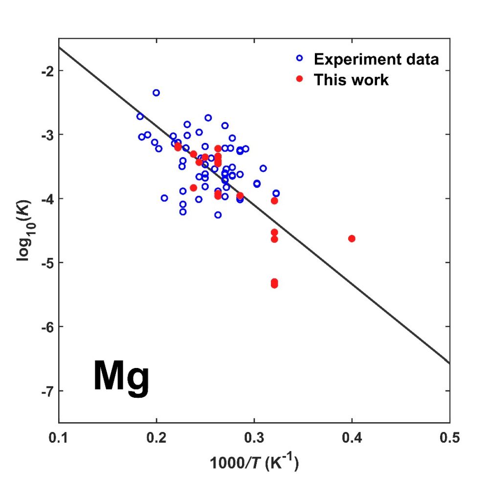 Mg和O。蓝色圆环代表过去的高温高压实验数据,红色圆点是本次实验得到的数据。黑线是回归得到的镁的平衡常数与温度的关系。高温下,硅酸盐中的MgO趋向生成Mg和O进入液态铁中
