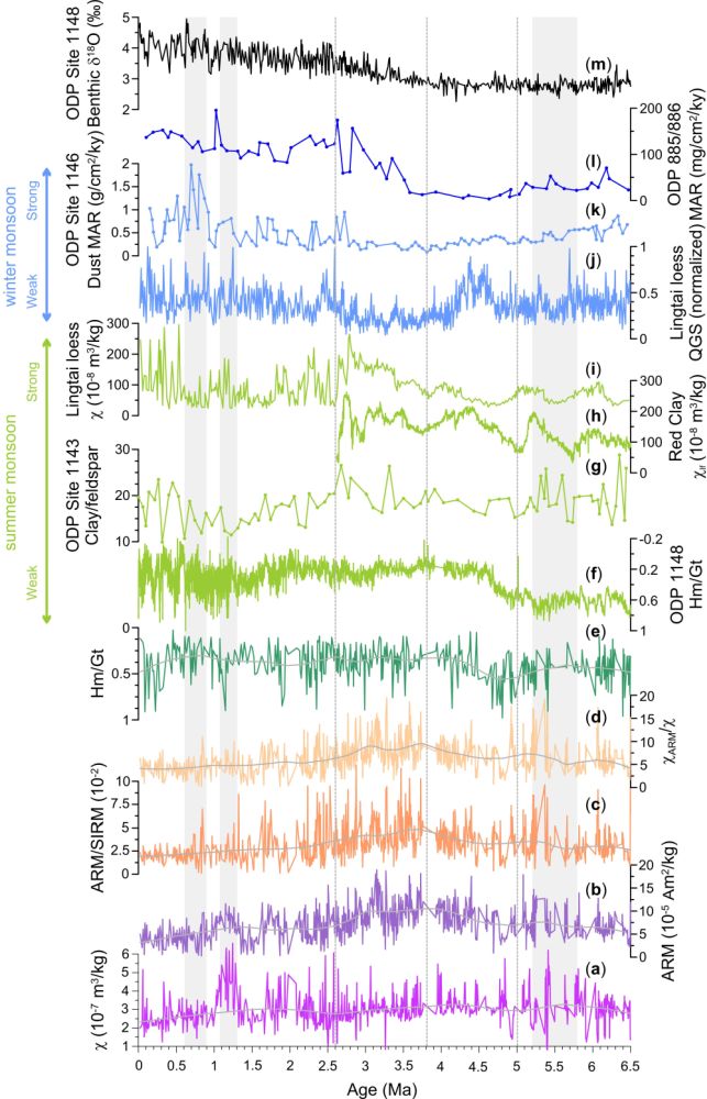 图3 6.5 Ma以来的海洋和陆地气候变化记录。(a-e)南海中部U1431D孔的c, ARM, ARM/SIRM, cARM/c, 和Hm/Gt记录;(f)南海北部ODP1148站位的Hm/Gt记录(Clift, 2006);(g)南海南部ODP1143站位的粘土/长石记录(Wan et al., 2006);(h)黄土高原石楼地区红粘土的clf记录(Ao et al., 2016);(i-j)黄土高原灵台黄土的磁化率c和石英粒径记录(Sun et al., 2010);(k)南海北部ODP1146站位的粉尘累积速率(Wan et al., 2007);(l)北太平洋885/886站位的粉尘累积速率(Rea et al., 1998);(m)南海北部1148站位底栖有孔虫δ18O记录(Tian et al., 2008);(a-e)中灰线为LOESS平滑后的趋势线