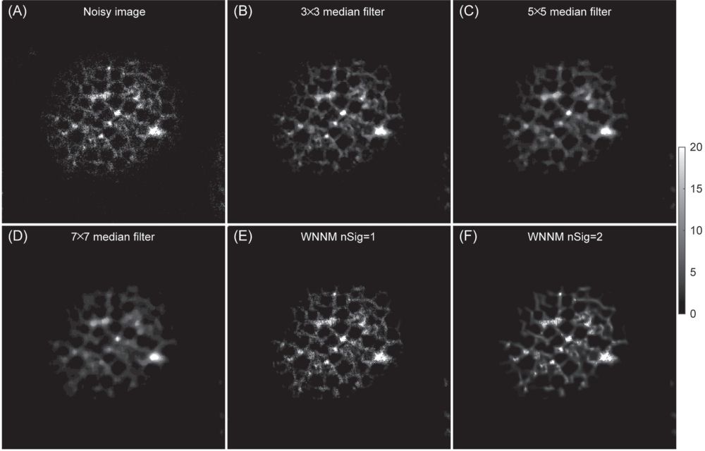 为了提高小颗粒弱信号样品的图像质量,项目组以海底热液矿床草莓状黄铁矿的元素图像为例进行了降噪处理。采用加权核范数最小化算法(weighted nuclear norm minimization, WNNM),将样品真实的元素分布图像用一个低秩矩阵来近似描述,而噪音数据则增加了整个矩阵的秩。通过求取原始图像矩阵低秩近似解,从而实现了对离子图像的去噪处理。
