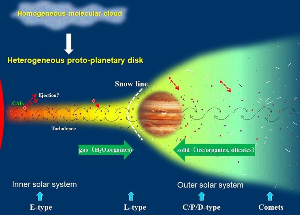 但是,国际上倾向于选择碳质小行星,而它们全部形成于木星以远的外太阳系区域。地球和类地行星均属于内太阳系,它们与外太阳系天体具有完全不同的同位素组成。为了描绘太阳系第一个1000万年的形成过程,林杨挺等提出选择4大类型原始的小天体作为探测目标,分别代表太阳星云盘的关键位置(图1):