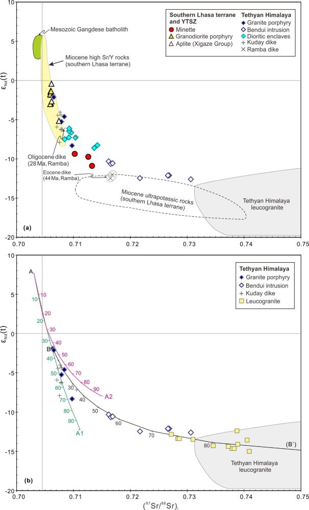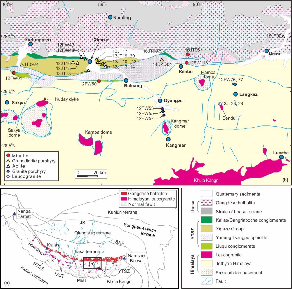 渐新世-中新世是青藏高原形成和演化的重要时期,基本奠定了高原现今的整体格局。青藏高原南部初始碰撞后消失的岩浆活动在该时期变得活跃,拉萨地块、雅鲁藏布缝合带和喜马拉雅地区均广泛发育岩浆岩。这些岩浆岩在形成时间上具有较好的关联性,但是在岩石类型和地球化学组成上却差异明显。雅鲁藏布缝合带北侧的拉萨地块以发育超钾质岩石和钙碱性埃达克质岩石为主,分别来自于交代岩石圈地幔和加厚下地壳的熔融,岩浆形成过程中存在地幔热源和物源的重要贡献;缝合带南侧的喜马拉雅地区则主要发育淡色花岗岩岩浆活动。传统观点认为喜马拉雅淡色花岗岩来自于变沉积岩的部分熔融,可以作为S型花岗岩(源岩为沉积岩)的典型代表,并且淡色花岗岩形成和喜马拉雅造山过程中不存在地幔的贡献。为什么已经碰撞拼合三十个百万年后,这些空间上紧密相邻地区的岩石类型和深部动力学过程具有如此明显的差异?或者,喜马拉雅淡色花岗岩由于经历了强烈的岩浆演化和地壳混染,已经不能代表原始岩浆性质,因此也难以准确反映深部动力学过程。