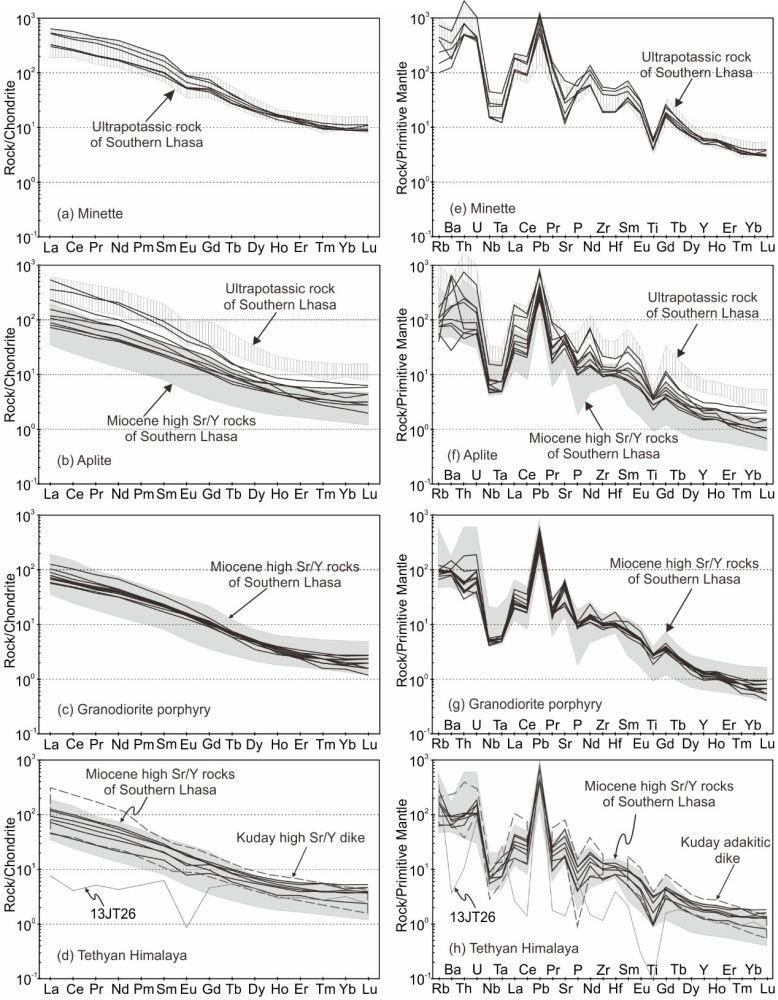 (3)喜马拉雅地区岩脉类型主要为花岗斑岩,其主量和微量元素组成均与拉萨地块中新世加厚地壳来源埃达克质岩相似,如明显的轻-重稀土分异、弱的Eu异常、高的Sr含量、高的La/Yb和Sr/Y比值(图2d和图2h)。该花岗斑岩脉可能来自于喜马拉雅地区加厚地壳的熔融,这表明中新世时期青藏高原南部地区广泛发育加厚地壳熔融事件,可能与深部俯冲的印度大陆岩石圈的移除有关。
