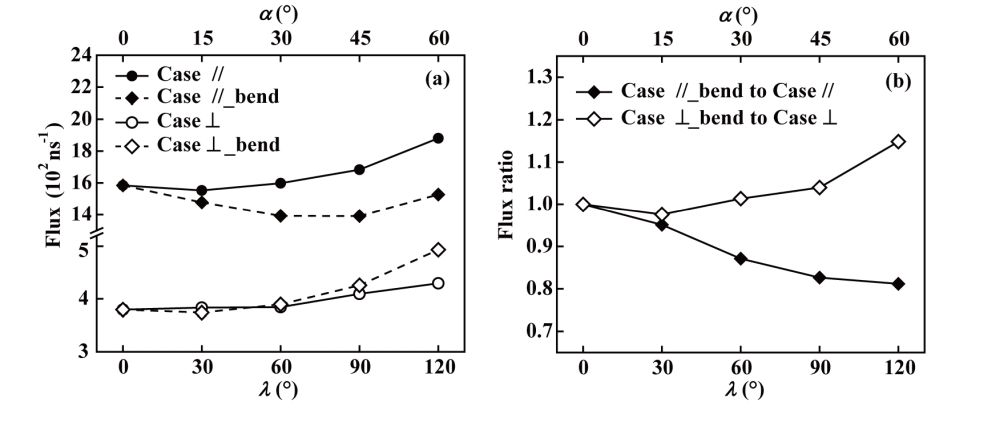 图2 (a)甲烷流量分别随倾斜角(圆圈)和转向角(菱形)的变化;(b)弯折孔道相对于倾斜孔道的流量比值随转向角的变化(排除了倾斜角的影响)