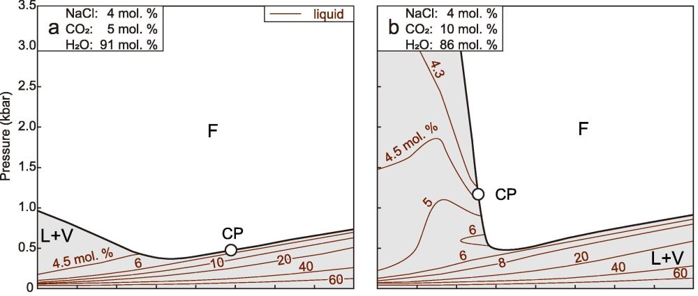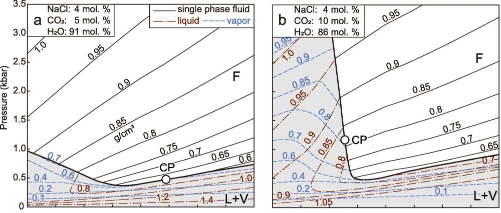 H2O-NaCl-CO2三元混合流体在岩浆、变质和热液系统中很常见,在成岩和成矿中发挥着重要作用。造山型金矿是世界上最为重要的金矿床类型,矿化以多期H2O-NaCl-CO2±CH4流体叠加成矿为特征。衡量热液系统中流体相平衡和热力学性质(PVTx),对分析成矿流体演化和成矿作用发挥着重要作用。然而早期大量的模拟研究,基于其简便性,多以H2O-NaCl和H2O-CO2二元系统近似描述地质系统中的热液流体(e.g., Anderko and Pitzer, 1993; Driesner and Heinrich, 2007; Mao et al., 2015),缺乏H2O-NaCl-CO2三元系统热力学模拟计算及其地质应用。此外,研究发现造山型金矿普遍存在多种结构的含金石英脉,金与石英沉淀近同时,两者关系密切;石英中流体包裹体类型多样,普遍赋存富CO2流体包裹体,且流体普遍发生不混溶过程。不同类型的流体包裹体如何形成,能否代表成矿流体性质?如何解释造山型金矿普遍发生流体不混溶现象?能否通过反演石英脉形成过程限定金矿化条件?
