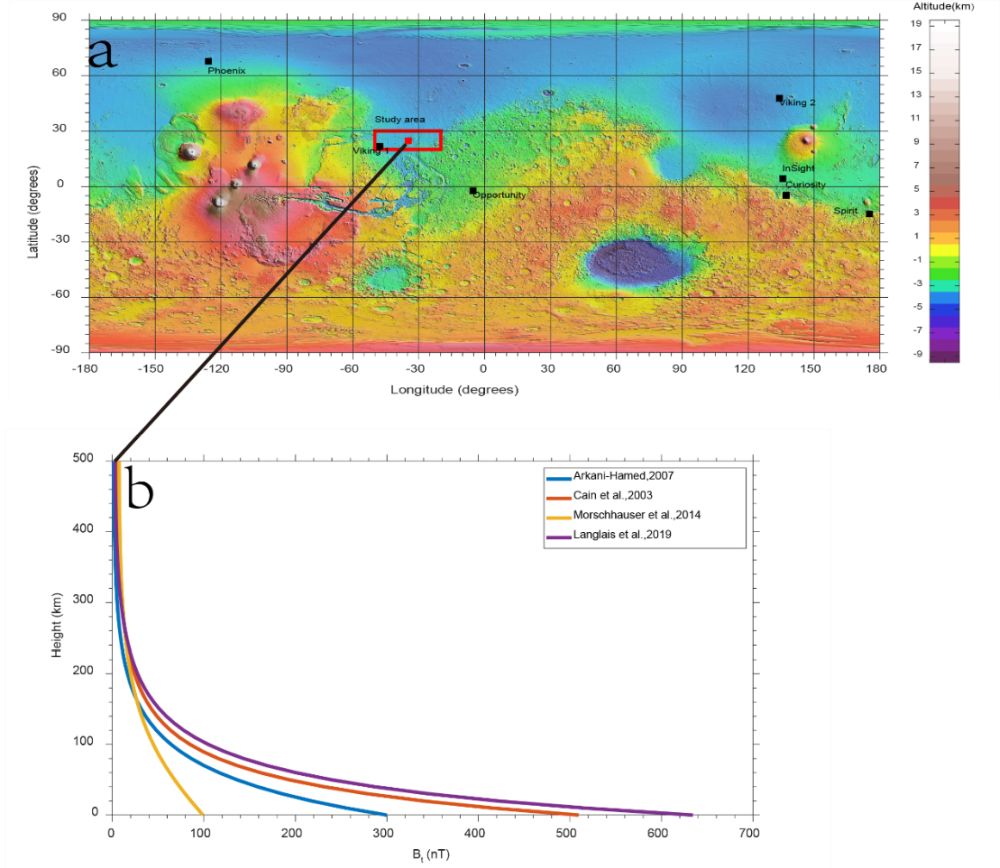 图1 (a)火星地形图。其中2020年我国火星车的着陆区域用红色矩形标出,中心位置(35°W,25°N)用红点标记。(b)红点位置处,不同火星全球磁场模型给出了磁场强度Bt随高度的变化