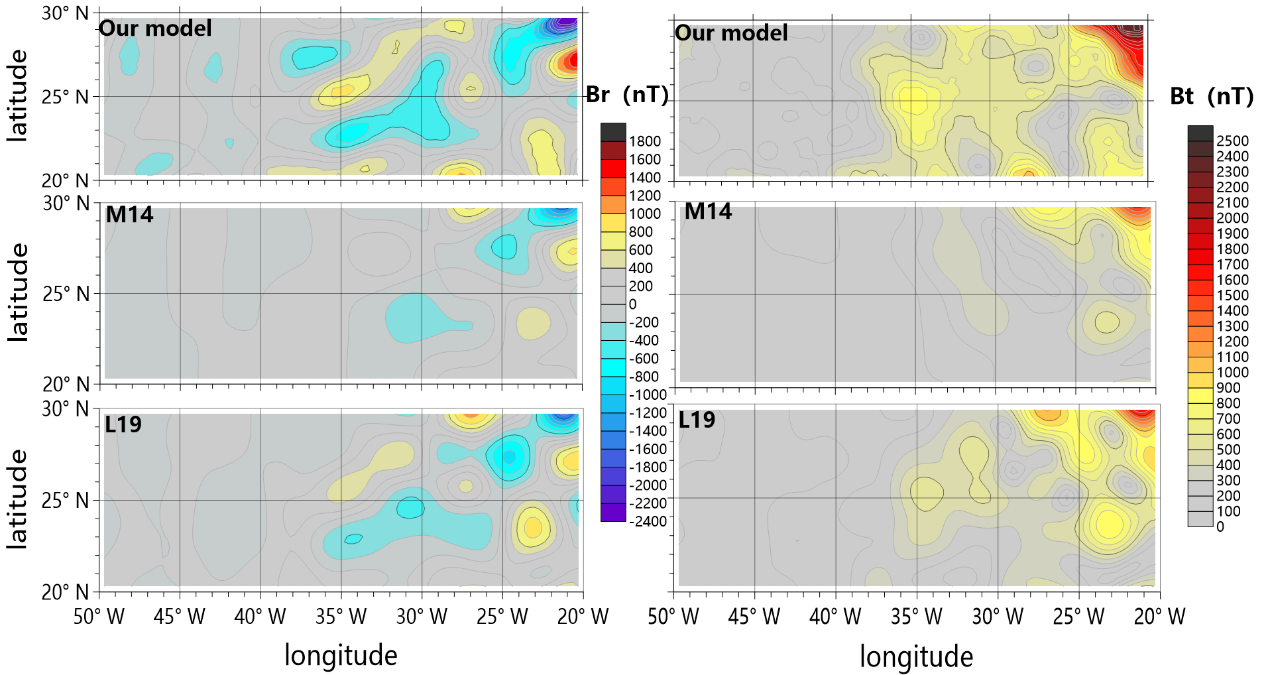 2020年7月,我国将执行“天问”火星探测计划,该计划包括环绕器和火星车,其中一个重要科学探测任务就是利用火星车上搭载的磁强计测量火星表面的岩石剩余磁场。但是从当前诸多火星全球剩余磁场模型来看,这些模型外推到火星地表的磁场还存在可靠性问题(图1)。为中国火星车的着陆区域(20°W-50°W,20°-30°N)提供一个相对可靠的局地剩余磁场模型,对于提前设定探测仪器参数、安排和布局探测方案具有重要参考价值。