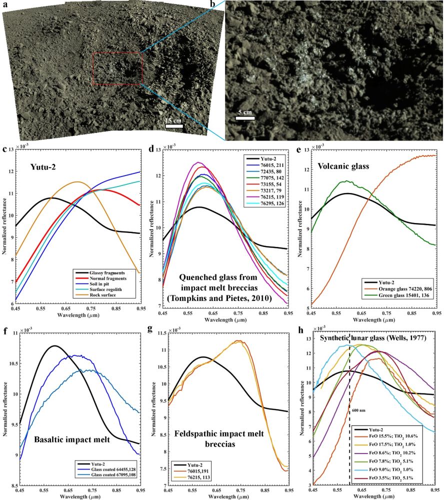根据避障相机数据生成的高程数字模型,其中一个“碎块”坑的直径约为2 m,深约30 cm,坑底部有中央凹陷(2。探测数据表明,坑中的大部分碎块小于5 cm,坑内碎块与坑外月壤的光谱特征很接近,但与新鲜石块明显不同(3)。此外,坑内月壤与碎块也有相似的光谱形状,表明它们具有类似的组成。在坑的中心,有一簇高反照率且呈现蓝绿色调(3)的碎块,可能是玻璃碎片。玻璃碎片与同一坑内的月壤、普通碎块以及月表石块光谱明显不同(3c)。玻璃碎片具有不寻常的高反照率,并在~600 nm显示出明显的反射峰,与撞击熔融或火山作用产生的玻璃光谱特征一致。根据阿波罗样品分析,只有当玻璃含量大于60%时,才能在玻璃/晶体混合物的光谱中观察到明显的玻璃特征。通过与阿波罗号样品比较(3),可认为“玉兔二号”观测到的高反照率碎片是相当纯净的玻璃。与不同铁钛含量的玻璃对比,发现含9.0% FeO1.0% TiO2的玻璃与月球车观测到的玻璃光谱反射峰位置最为接近,这与着陆区的低铁钛特征一致( 12.6% FeO,~1.4% TiO2)