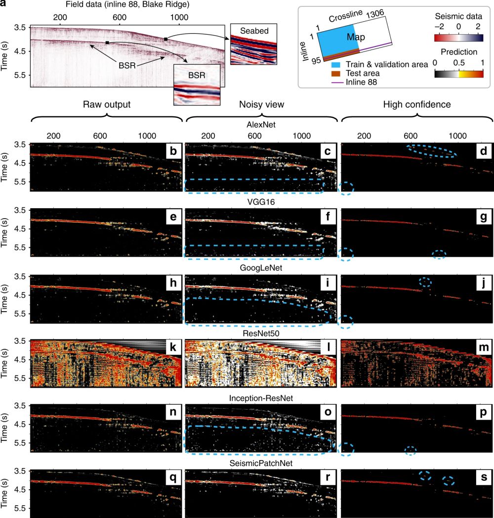 与国际上标准的神经网络模型对比显示:本研究的神经网络架构参数的存储量约为著名的VGG-16架构的0.5%。SPN的预测速度比ResNet-50快近18倍(图2),并且在识别海底天然气水合物资源指标似海底反射(BSR)方面显示出压倒性的优势(图3)。显著性映射表明,该研究提出的架构很好地捕捉了关键特征,显示出以极低的计算成本进行多个地震数据集的端到端解释的前景。