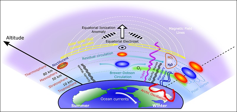 平流层爆发性增温(Sudden Stratospheric Warming, SSW)现象是典型的地球低层大气波动现象。在平流层爆发性增温发生时,极区平流层温度突然升高,在几天之内温度增加幅度可达几十K。同时,中间层和低热层纬向环流出现明显减弱,甚至发生转向。平流层爆发性增温事件提供了研究大气波动与电离层耦合的绝佳机会(图1)。已有观测和模式结果表明,在平流层爆发性增温期间,电离层可能会产生巨大的变化。