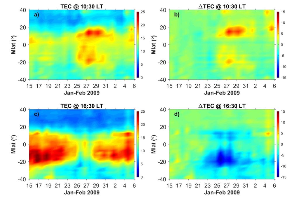 他们分析MIT TEC资料发现(如图2所示),在2009年1月SSW期间,电离层电子密度展示出强烈的南北半球不对称性。电离层这种南北不对称表现为,上午时段TEC增强主要集中在北半球EIA(Equatorial Ionozation Anomaly)区域,南半球增强幅度较弱;下午时段TEC发生减弱,主要集中在南半球EIA区域,北半球减弱幅度较小。