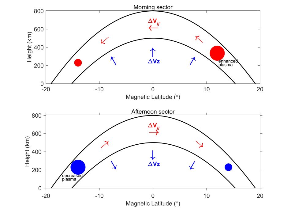 他们利用美国空军“通信/导航中断预报系统”卫星(C/NOFS)搭载的离子漂移计观测资料,发现在SSW期间,除了电场漂移,沿着磁力线方向的等离子体速度展示出显著的半日变化:在上午时段呈现南向的扰动,下午转为北向的扰动(如图3所示)。