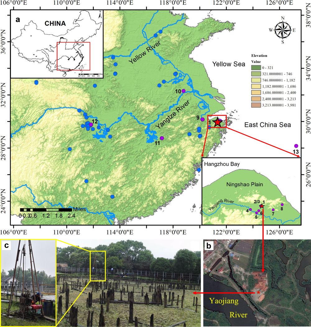 图1 (a)河姆渡遗址位置以及早于7000 BP的稻作农业遗址分布图;(b,c)钻孔位置及野外打钻照片