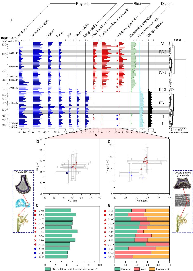 河姆渡遗址(7000-5000 BP)发掘于上世纪70年代,曾经出土了当时世界上最古老的水稻和大量干栏式建筑,在中国稻作农业起源和史前文明研究中都具有里程碑意义。本次研究显示,7000 BP以来海平面上升速度的减缓促进了淡水湿地环境的形成和稻作农业的发展,首次在遗址底部海相层之下6.8-5.6 m的深度发现了水稻植硅体(图2a),将姚江河谷地区的人类活动历史和水稻驯化进程向前推进到8200-7600 BP,一定程度上突破了以往考古学中生土层以下无文化堆积的传统认识,对于今后中国沿海地区史前考古发掘具有重要启示意义。
