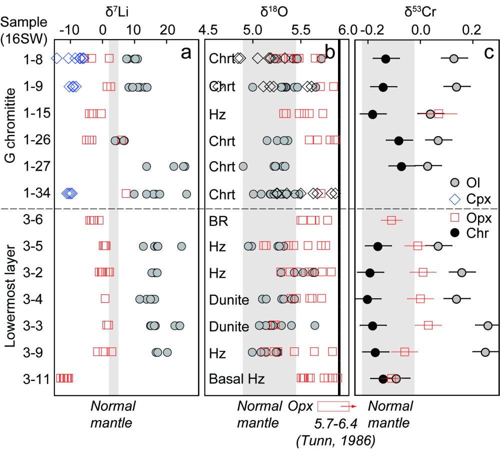 (3)橄榄石具有重于共生斜方辉石和单斜辉石的Li同位素组成,且δ7Li值的变化范围较大(图3a);大部分橄榄石的O同位素组成在正常地幔范围内,斜方辉石的δ18O值多高于正常地幔值,单斜辉石则具有最大的δ18O变化范围(图3b);异常的矿物Cr同位素组成,即δ53Cr呈现橄榄石>斜方辉石>铬铁矿规律(图3c;Bai et al. GCA 2019)。