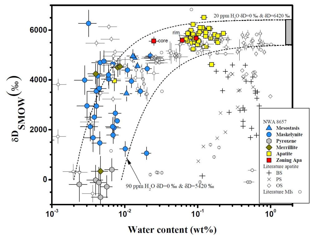 图1 NWA 8657火星陨石中磷灰石(Apatite)、白磷钙矿(Merrillite)、辉石(Pyroxene)、熔长石(Maskelynite)和填隙物(Mesostasis)的水含量和氢同位素组成的相关性。MIs:熔融包裹体,BS:玄武岩质火星陨石,PS:嵌晶质火星陨石;OS:含橄榄石斑晶质火星陨石。右上灰色方框代表火星浅表流体端元的H同位素组成