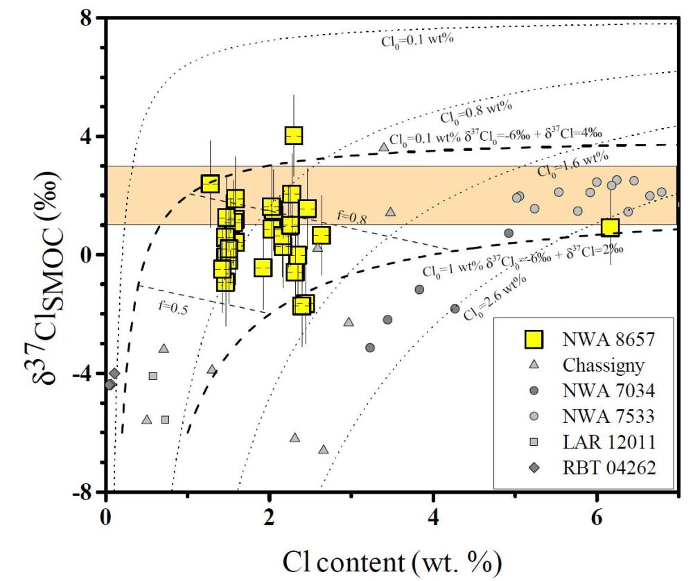 图3 NWA 8657火星陨石中的磷灰石具有与火星浅表流体几乎相同的H和Cl同位素组成。Tiss: Tissint,Sherg: Shergotty, LA: Los Angeles, EETA: EETA 79001C, Zag: Zagami, Chass: Chassigny, LAR: LAR 06319。虚线:不同端元的混合线