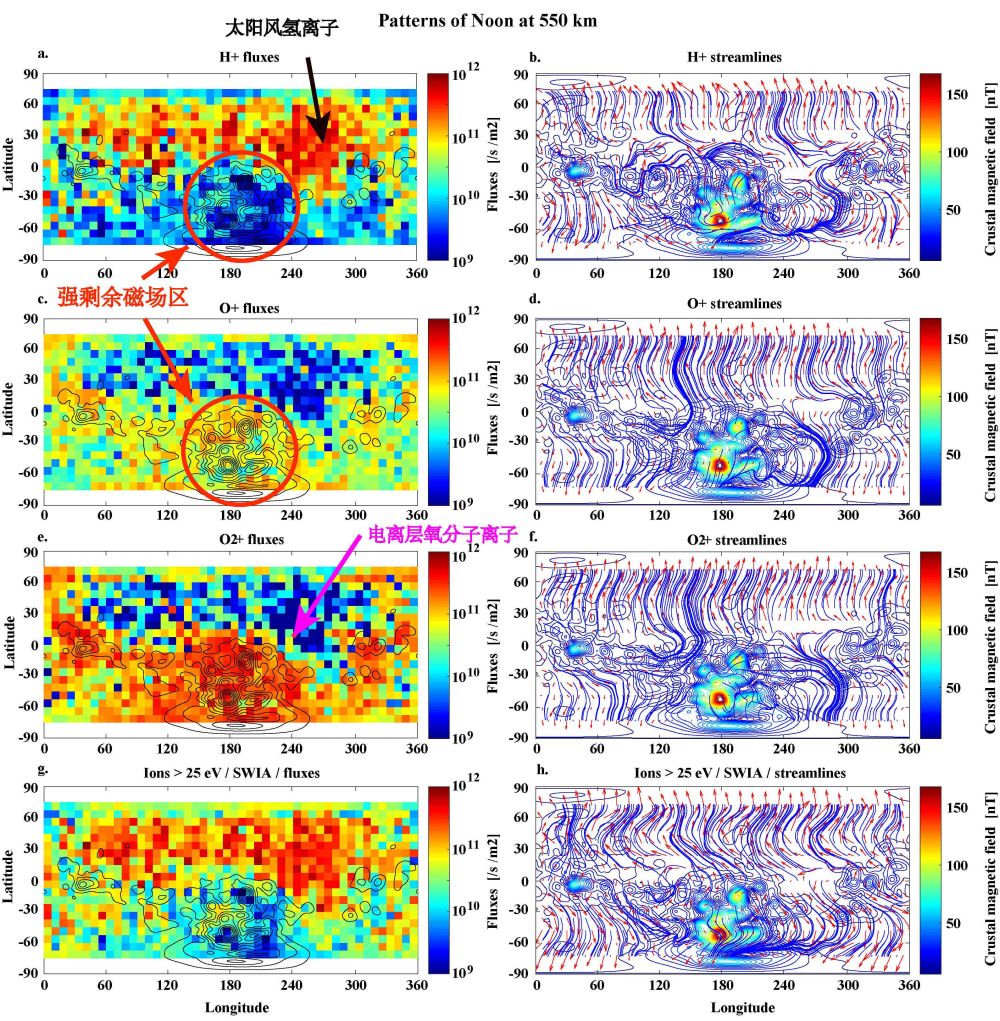 由于火星缺乏类似地球的全球性磁场环境,其高层大气中的氧离子、氧分子离子直接暴露在太阳风的剥蚀之中(图1)。太阳风驱动的离子逃逸过程导致火星在三十余亿年里损失了90%以上的大气,也是造成火星地表液态水消失的主要原因之一。1999年,人类首次在火星南半球发现区域性分布的地壳剩余磁场(Crustal magnetic field)。但是,这一局部磁场能否阻碍太阳风与火星离子之间的相互作用、能否有效保护火星大气引起了学术界的持续争论。