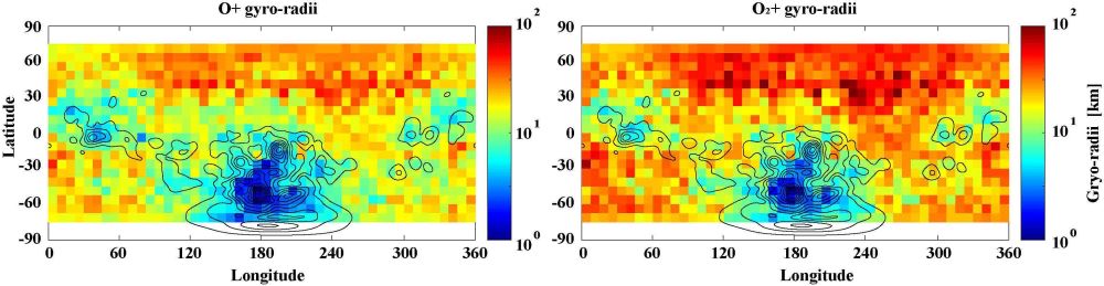 800彩票范开博士研究生与导师魏勇研究员和德国马克思普朗克太阳系研究所Markus Fraenz教授、中山大学崔峻教授等合作,根据美国MAVEN火星探测器2014至2018年高精度离子观测数据,首次发现火星剩余磁场在向阳面500至1000公里区域能够显著阻隔太阳风等离子体向南半球强磁场区域的注入。其中,太阳风源的H+分布在北半球弱磁场区;而在火星南半球强剩余磁场区域则与之相反,分布着火星电离层源的O+和O2+(图2)。两种不同来源的离子成分沿剩余磁场边界呈现典型的南-北不对称分布,且离子速度流线在强磁场区发生明显偏转。另外,火星南半球强剩余磁场区内O+和O2+的离子回旋半径比北半球无磁场区减少近两个量级(图3),表明剩余磁场有效束缚了火星大气离子使其更难发生直接性逃逸损失。